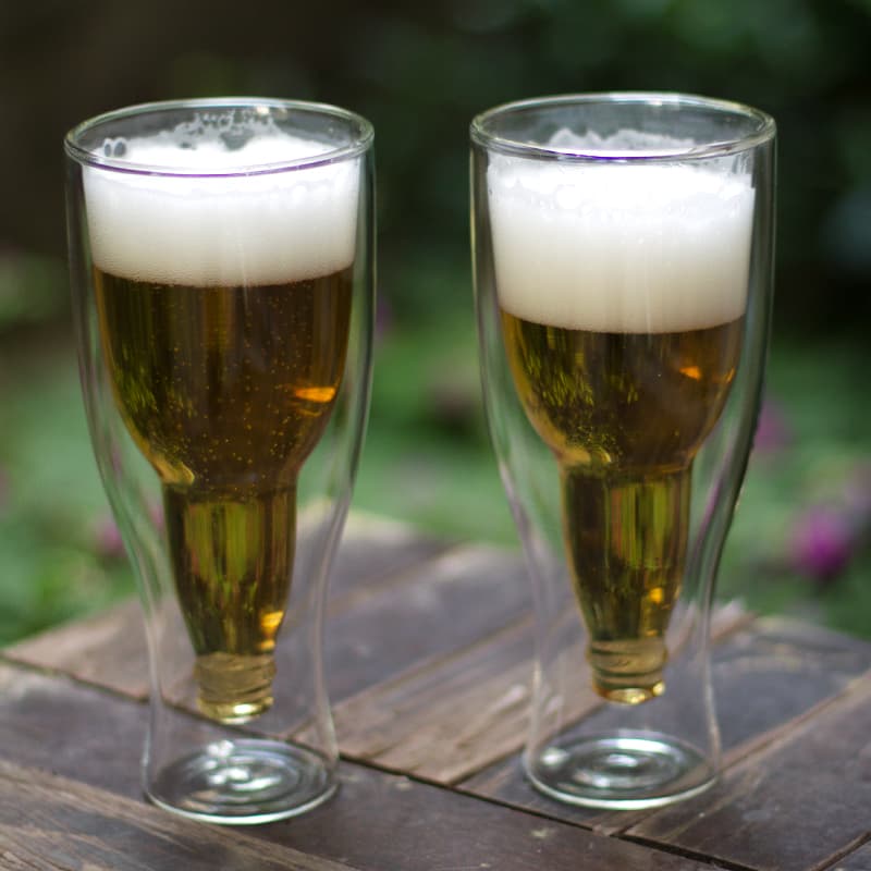 Комплект от две чаши за бира като обърната с главата надолу бирена бутилка.