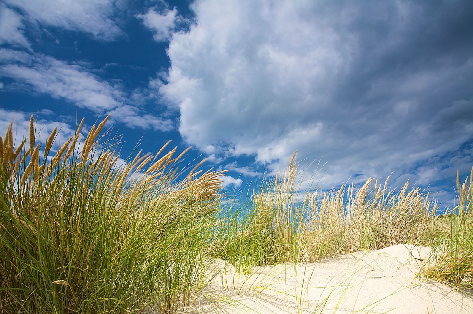 Тази снимка на пясъчно бели дюни с разлюлени от морския бриз треви създава усещане за простор и лятно везвремие.