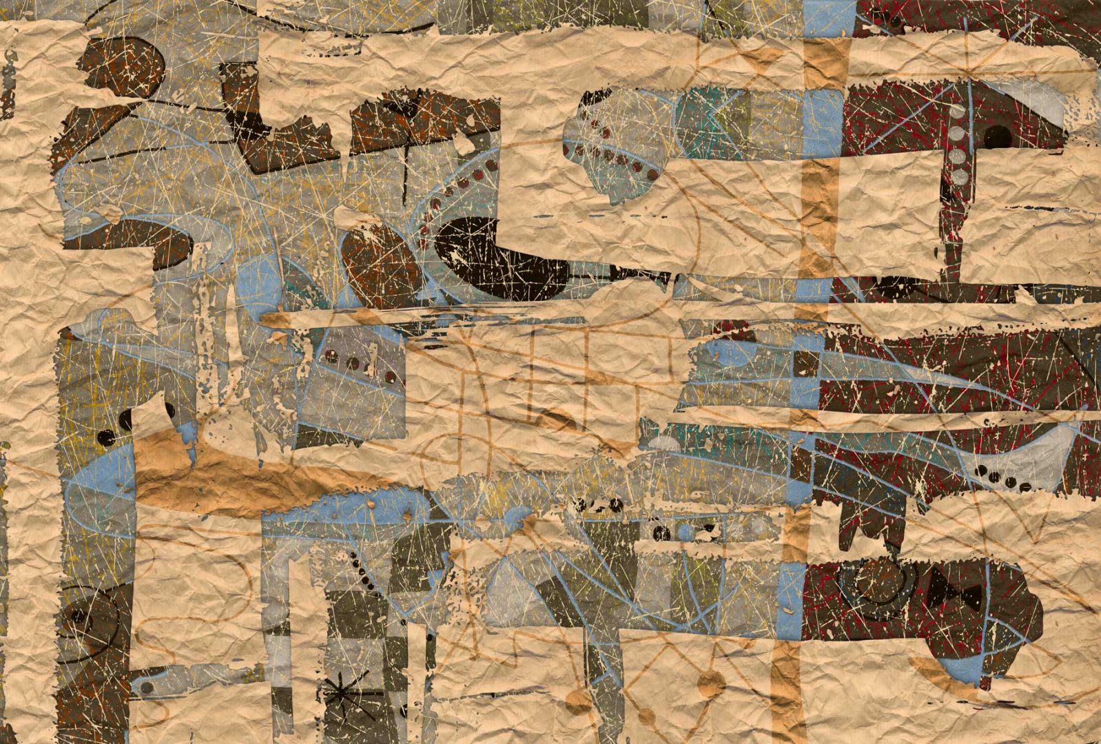 Тапетът е динамичен колаж от хартия, метал и керамични парчета, създаващ усещане за дълбочина и текстура. Форми и топлите нюанси напомнят за древни египетски мотиви, съчетавайки мистика и модерност. Дизайнът превръща стената в уникално визуално изживяване – тактилно, стилно и с културна дълбочина.