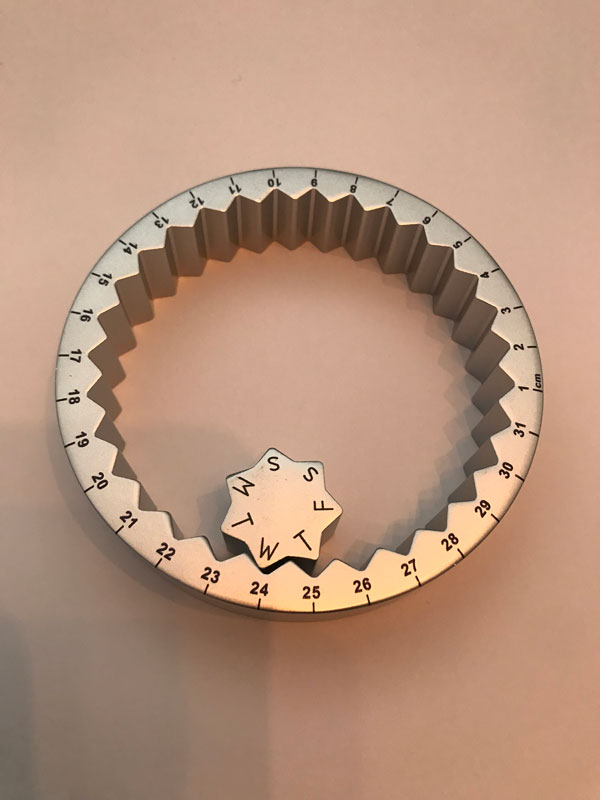 Малкото зъбчато колело маркира деня от седмицата, а голямото колело - този от месеца.