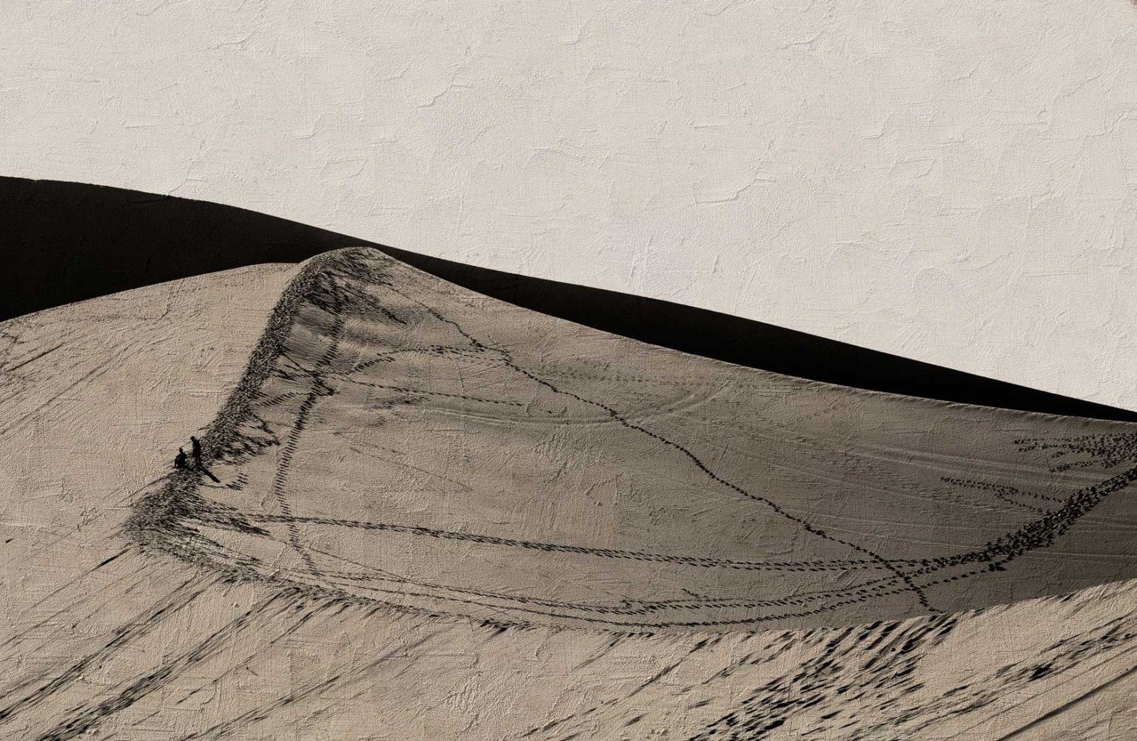 Тапетът „Стъпки в пясъка“ превръща стилизирано изображение на следи в пясъчни дюни  в минималистична, арт композиция. Неутралните тонове и деликатните сенки създават усещане за спокойствие, пространство и медитативна атмосфера.