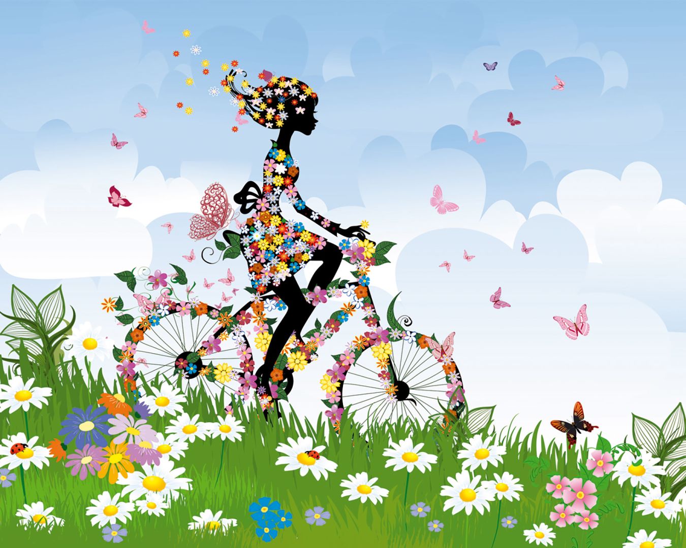 Стилизирана рисунка на момиче с цветя в косите, каращо своя велосипед по пролетна поляна, изпъстрена с цветя и пеперуди. За пораснали момиченца.