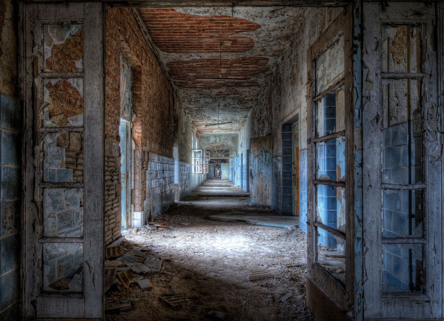 Изображението на разпадаща се стена и рушащи се коридори, благодарение на светлината, дава простор. Подходящо като контрапункт на ултрамодерни и големи пространства.