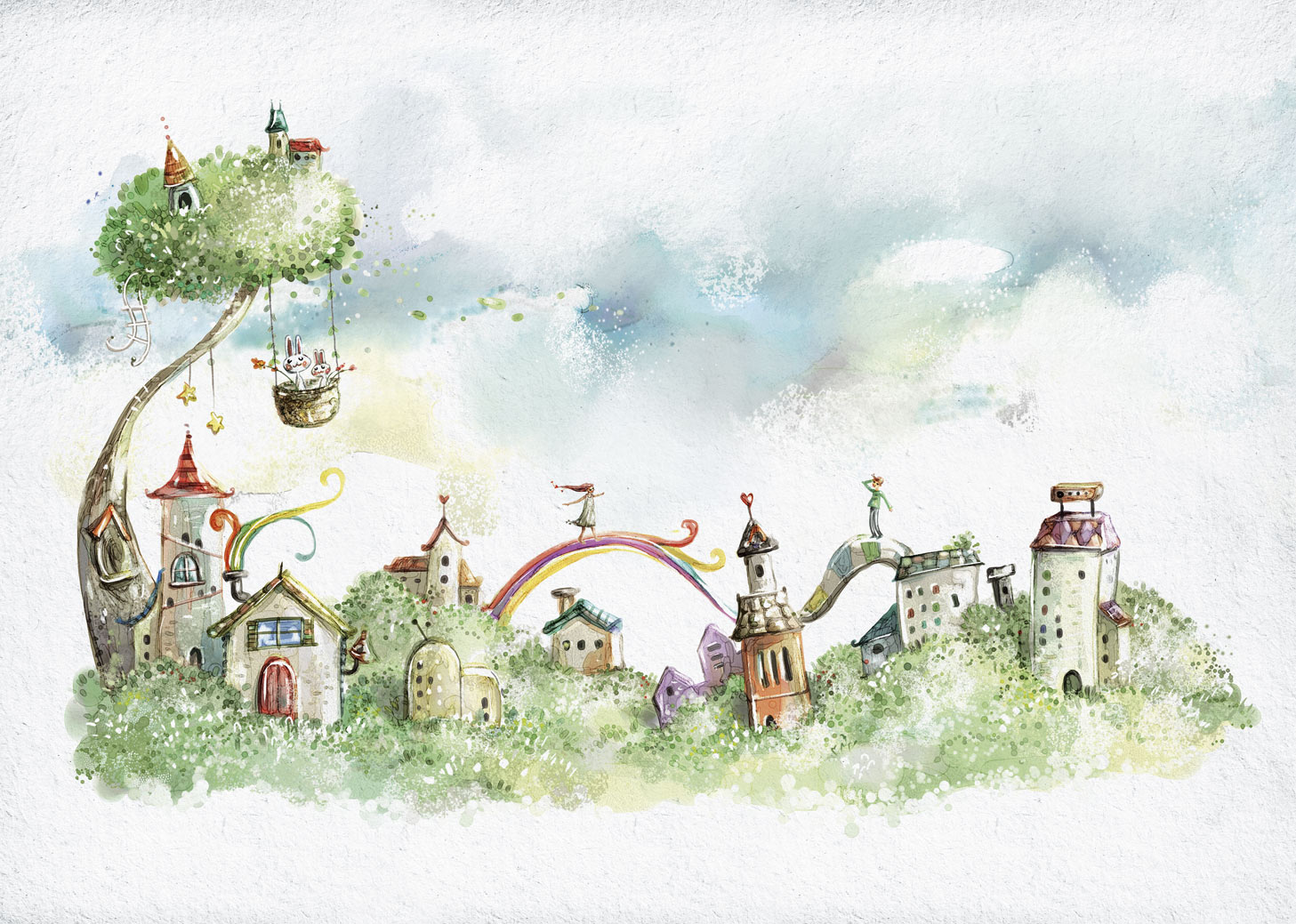 Рисунка на приказно царство, където червенокоска върви по вълните на пъстра дъга, за да достигне до своя приятел - момчето от кулата. Приказен сюжет, провокиращ детското въображение.