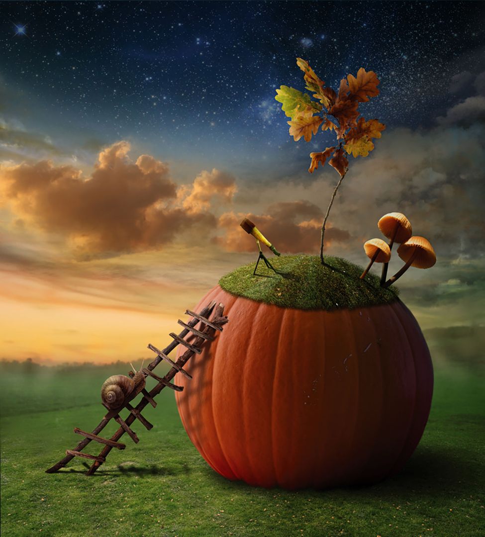 Приказна композиция с тиква-къща, охлюв, стълба, далекоглед и дъбово дръвче, която провокира детската фантазия.