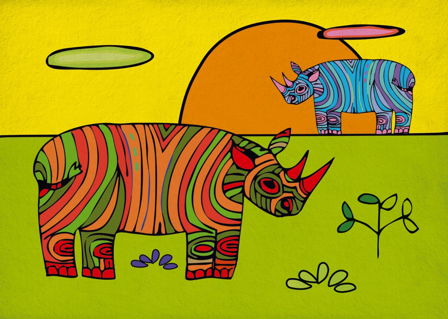 Тази стилизирана рисунка на двойка носорози е пъстро  и екзотично допълнение към интериора на порасналото дете.