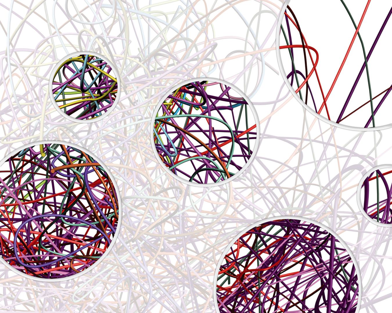 Визия с триизмерен ефект от преплетени кълба от връзки и матови кръгове, подходяща за юнешска стая, работни помещения и др.