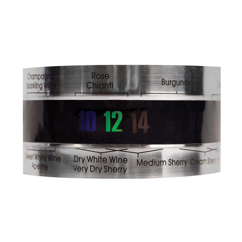 Термометърът е във форма на метална халка и отчита температурата на виното в бутилката.